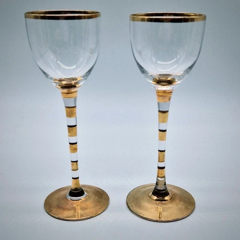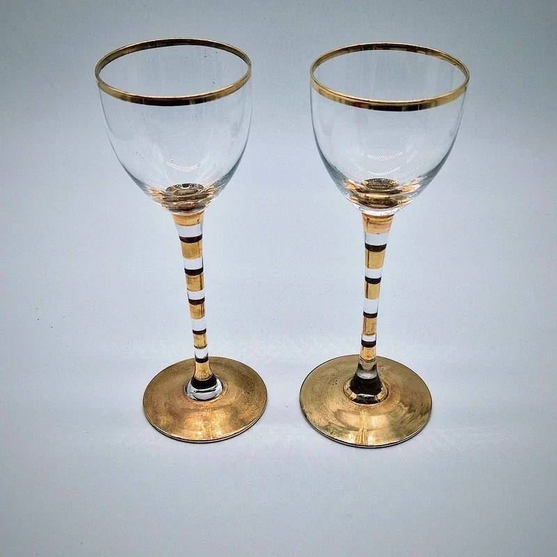 Twee prachtige aperitief glazen met goude gestreepte voet.