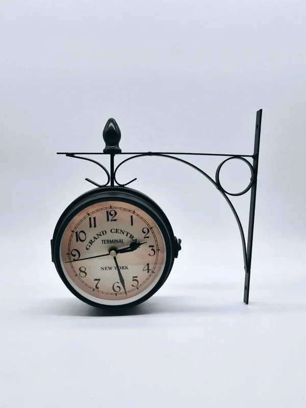Leuke dubbelzijdige stationsklok in zwart metaal. De wijzerplaat is geïnspireerd op de Grand Central Terminal in New York. De klok werkt op batterijen en is een mooie decoratie voor in huis of op kantoor.