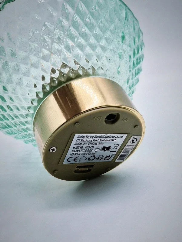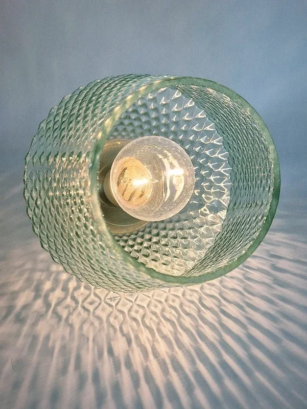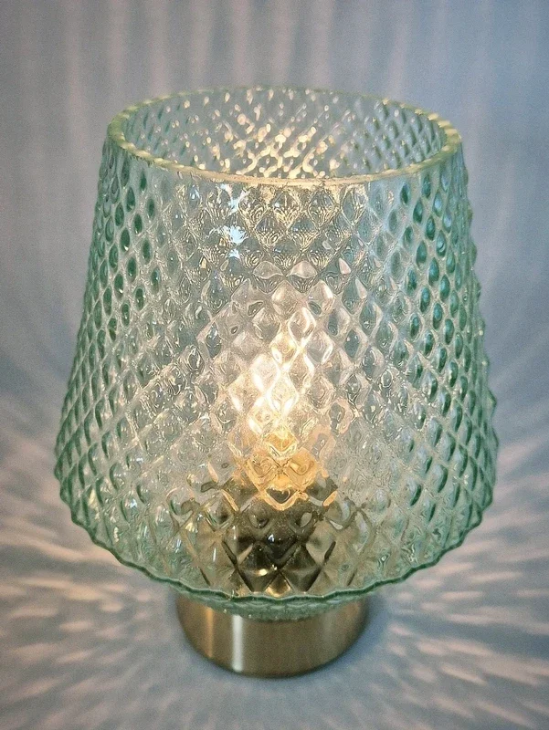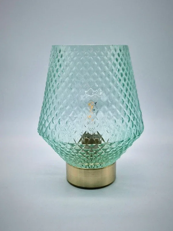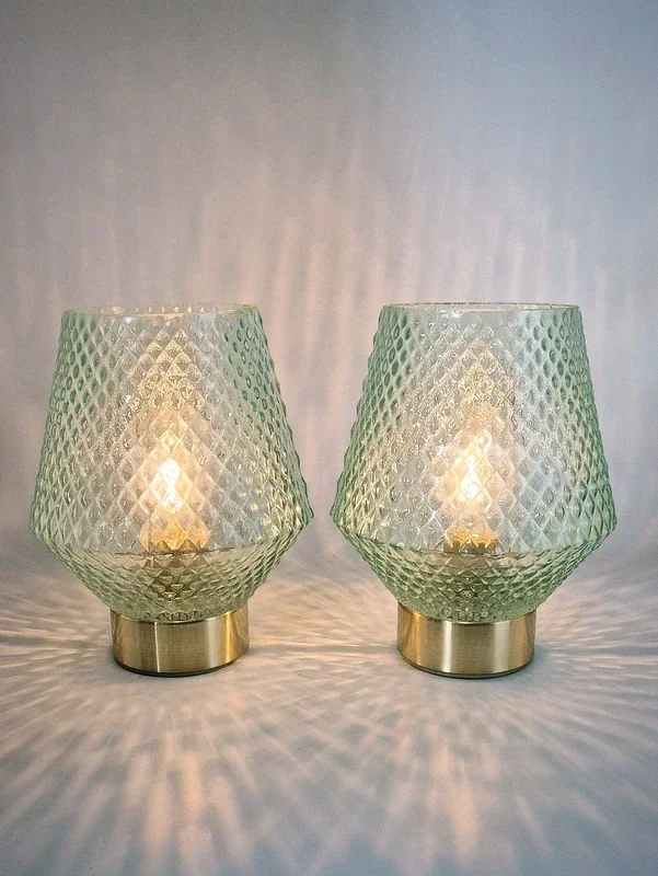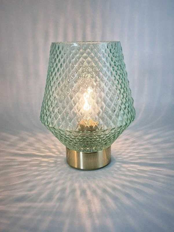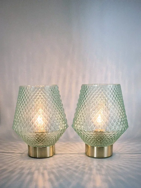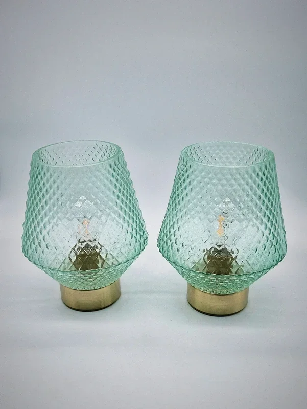 De lampenkappen zijn gemaakt van mintgroen glas met een mooi patroon. De voet is messingkleurig.