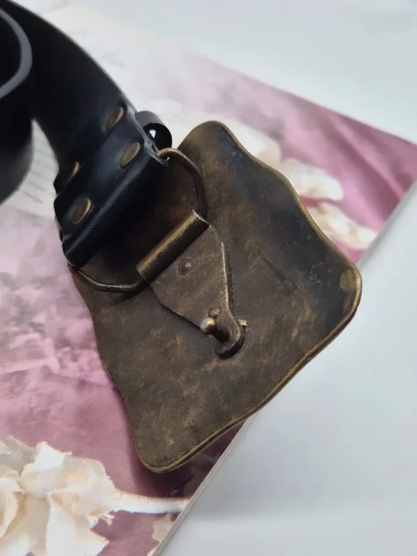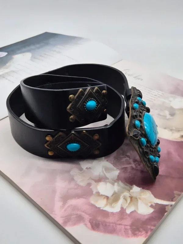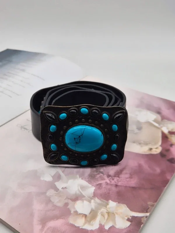 Prachtige zwarte riem met opvallende turquoise stenen.