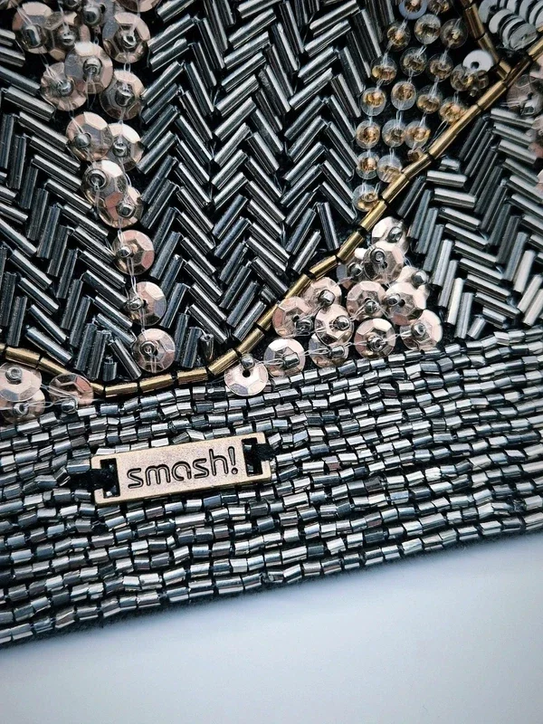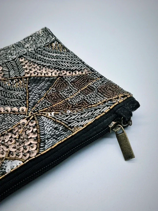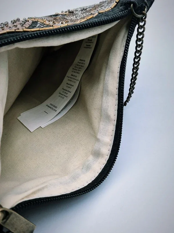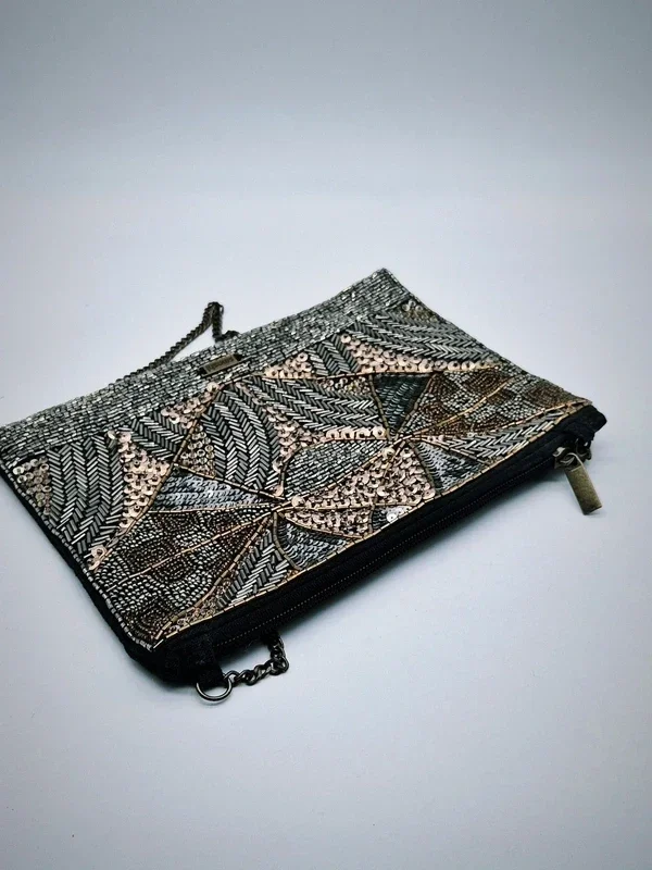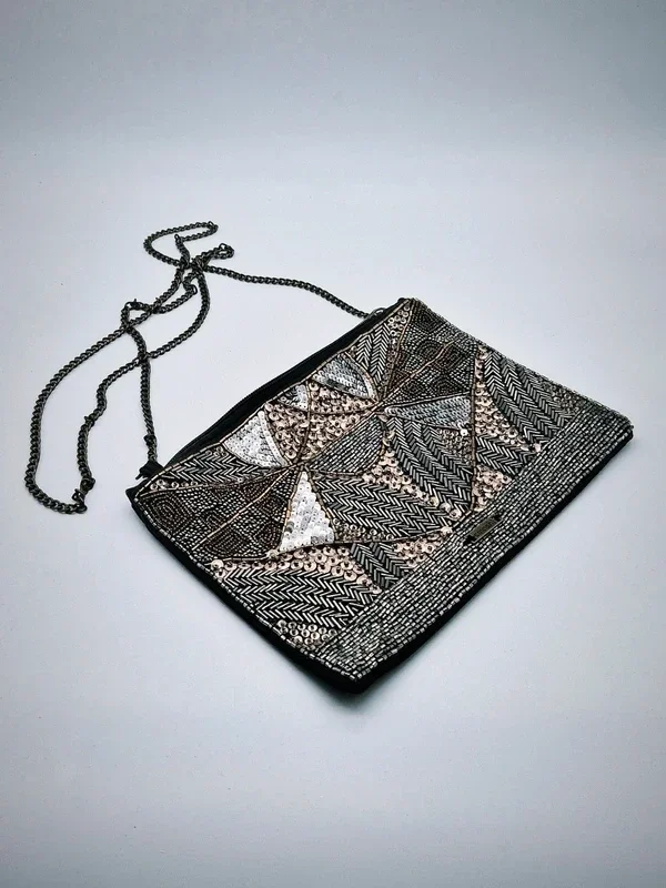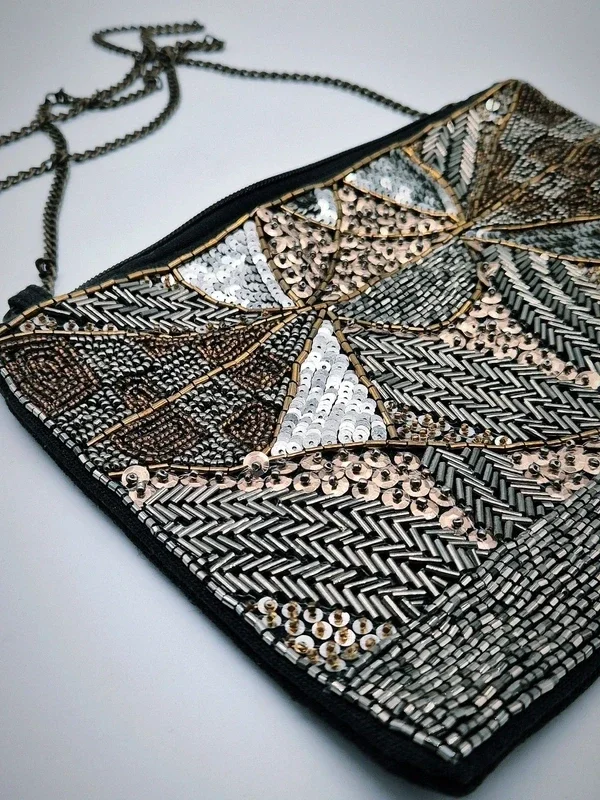 Het tasje is versierd met kralen en heeft een ketting van 1 meter 30 cm.