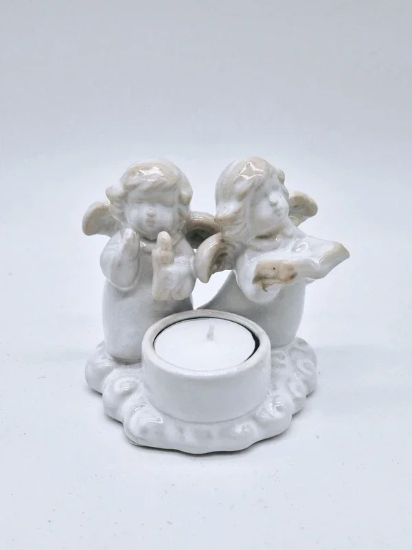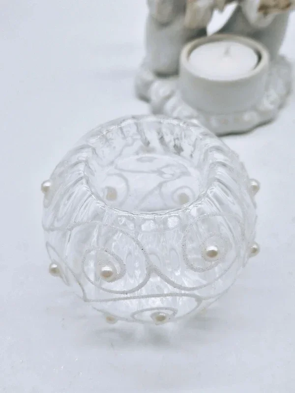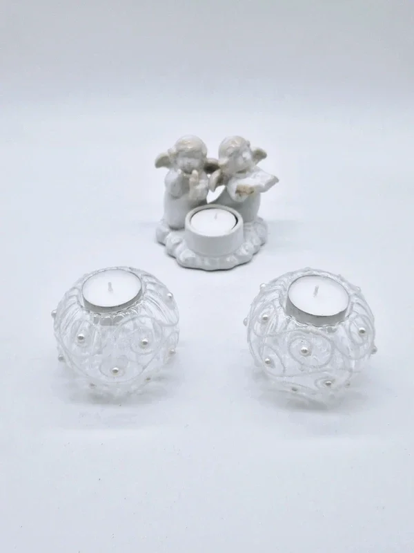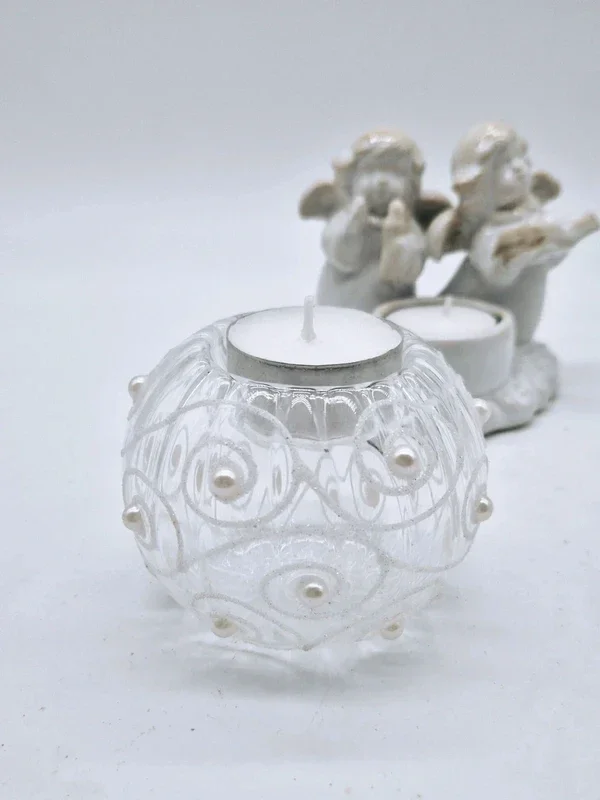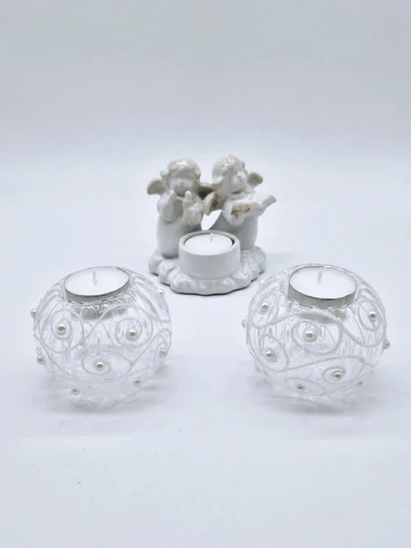 Twee glazen waxinelichthouders met parelmoer details en een Engel waxinelichthouder.