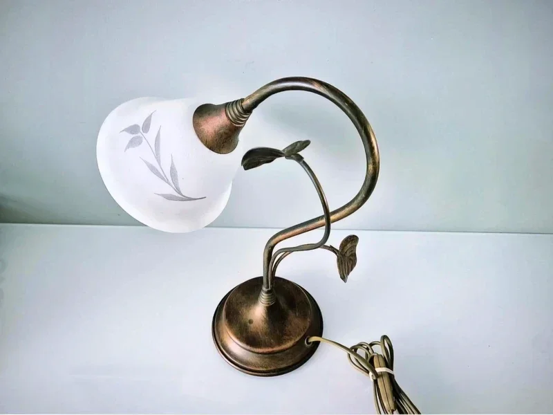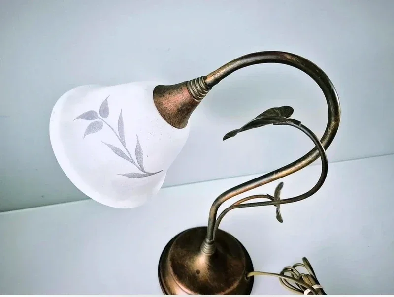 De lamp is gemaakt van ijzer met een matte glazen kelk.