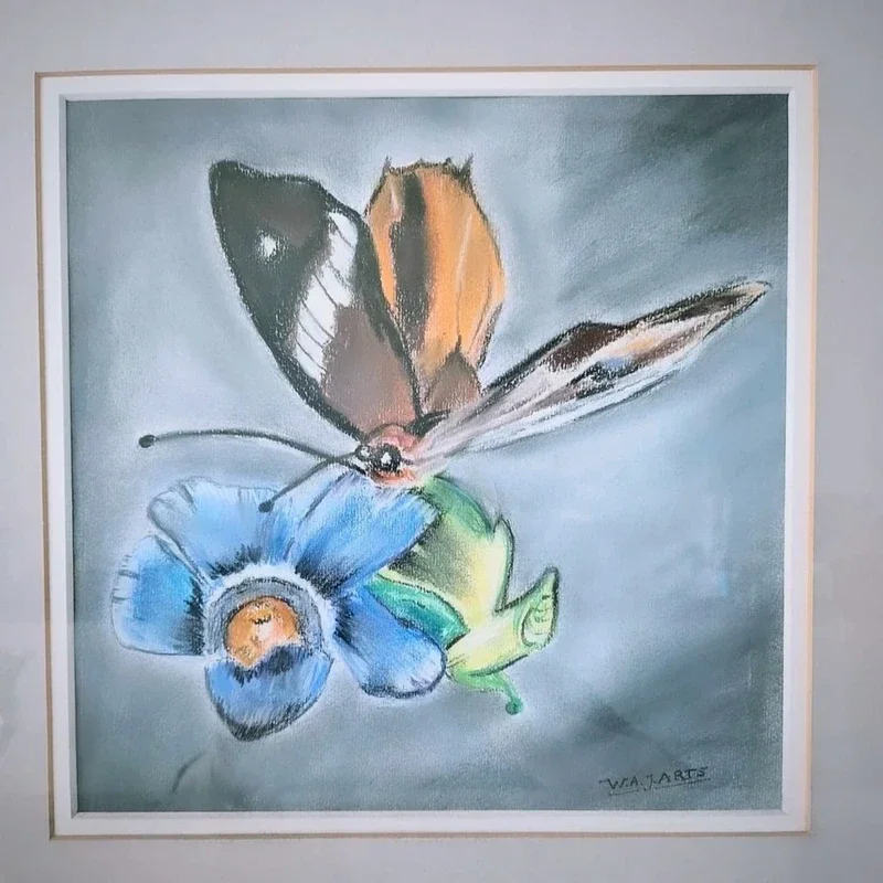 Prachtig schilderij met een vlinder op een blauwe bloem.