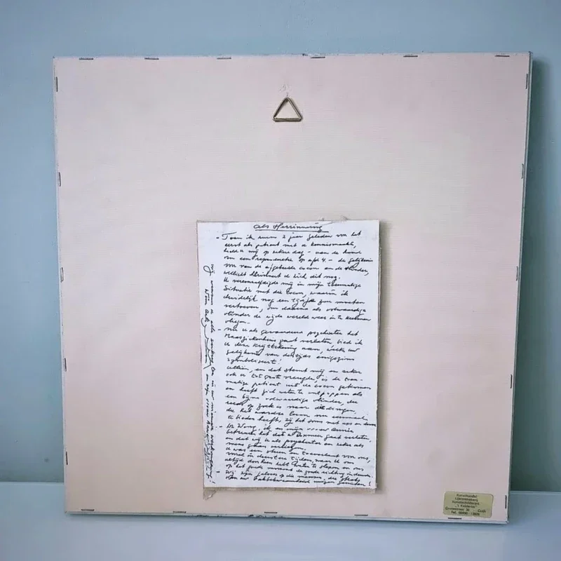 Het schilderij is ingelijst en de afmetingen inclusief lijst zijn 38 cm x 38 cm.
