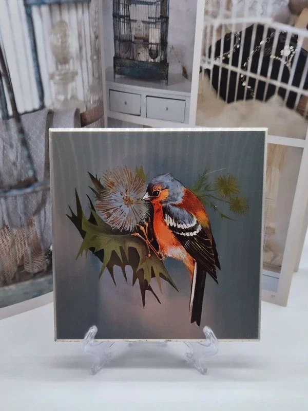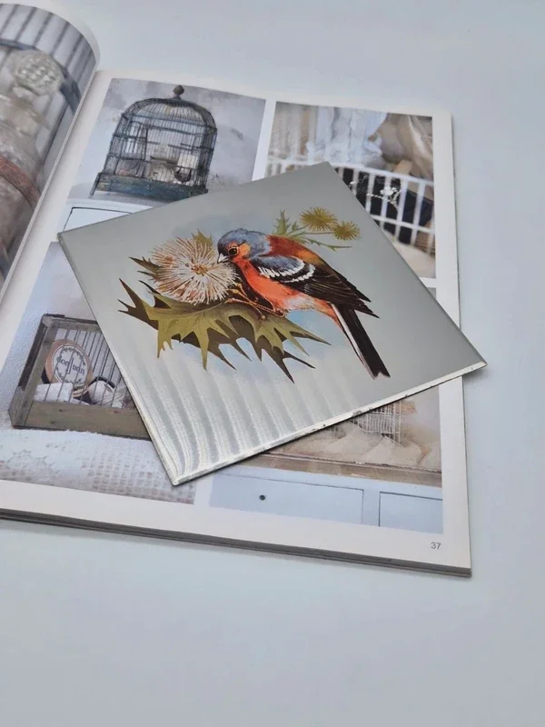 Prachtige metalen tegel met een afbeelding van een vogel op een bloemtak.