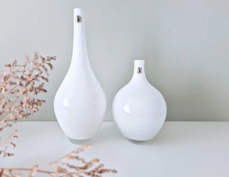 De vazen zijn in verschillende maten verkrijgbaar en zijn handgemaakt. De vazen hebben een dikke bodem en aan de bovenzijde, op de hals, zit een stickertje waaruit blijkt dat de elke vaas handgemaakt is.