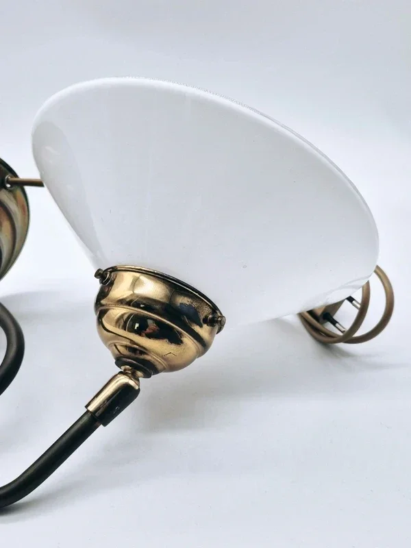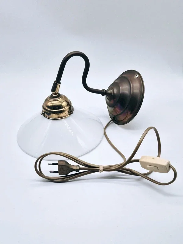 Klassieke wandlamp met een witte glazen kap en een gouden armatuur.