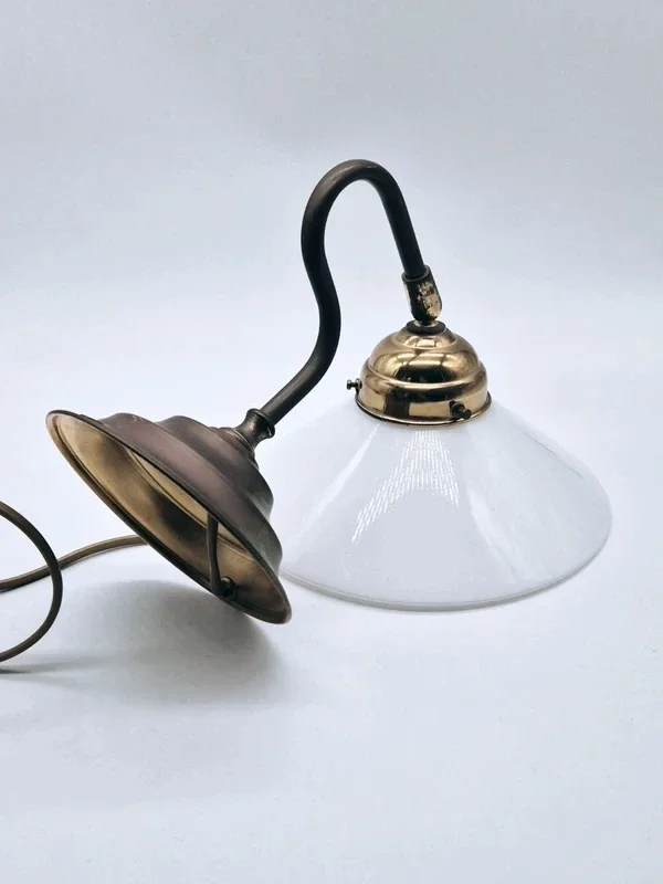 De lamp heeft een strak koperen frame met een goudkoperen buis.