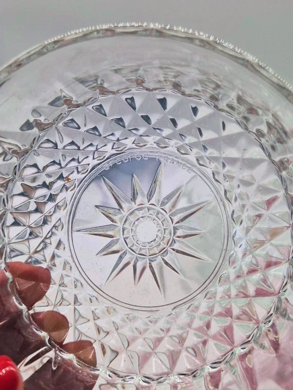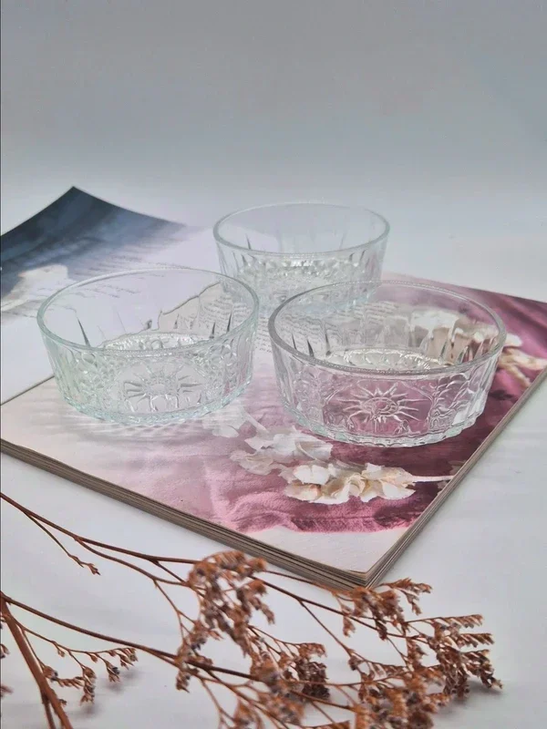 Prachtige set van drie vintage Arcoroc schalen met rijke gegraveerde decoratie.