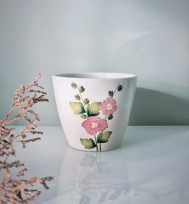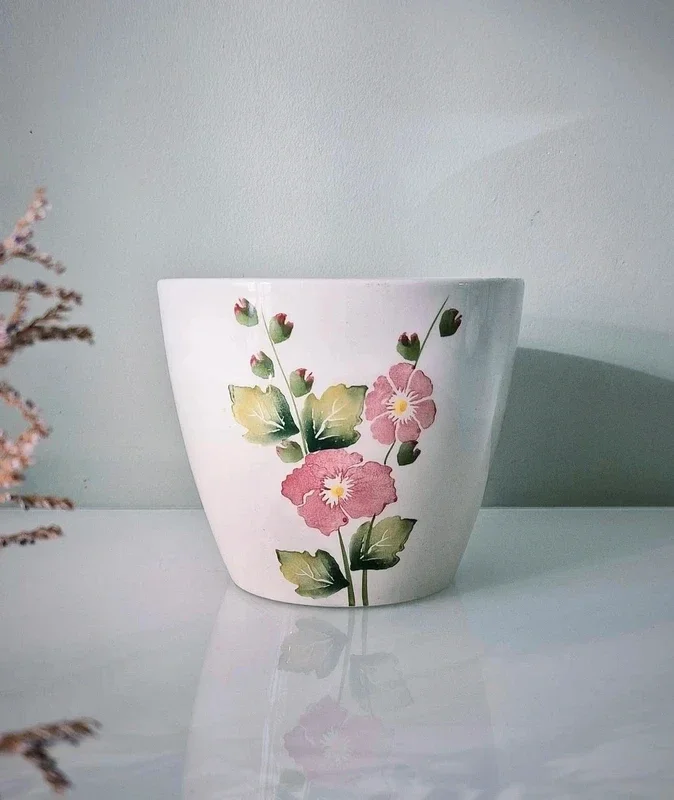 Charmante vintage bloempot met handgeschilderde bloemmotieven.