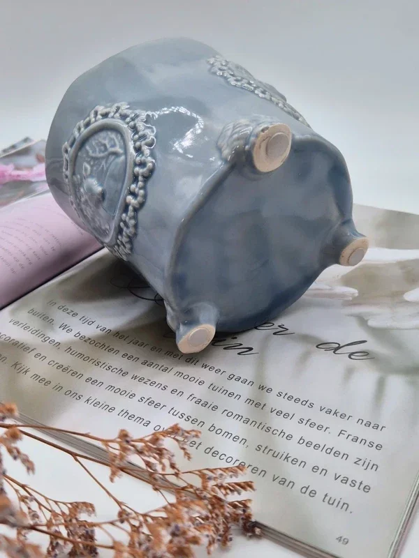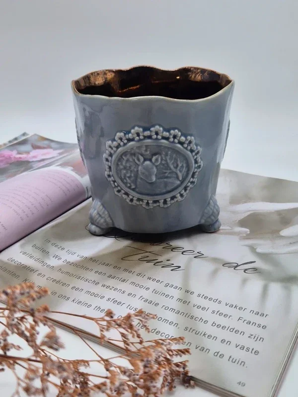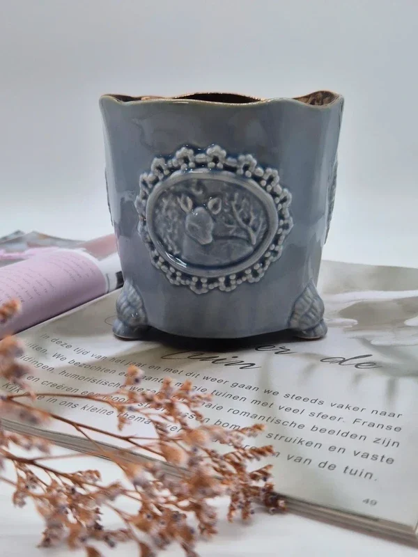 Prachtige brocante keramische bloempot in grijs kleur.