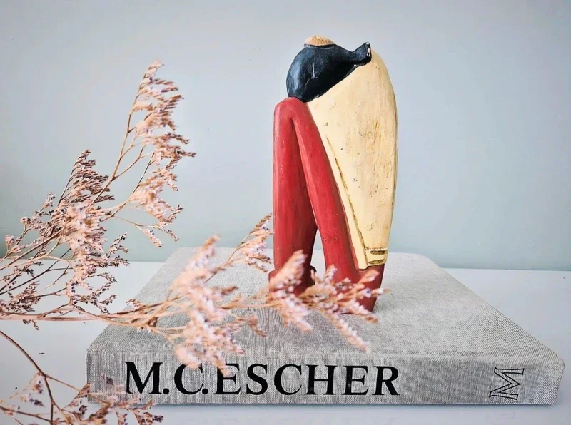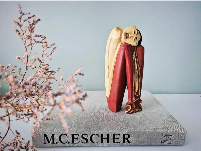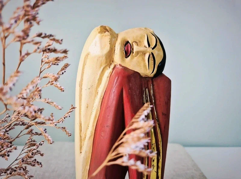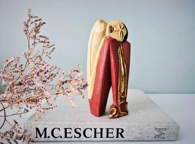 Vintage houten beeld, voorstellende een slapende figuur op zijn knieën.
