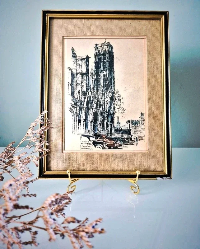 Vintage Collegiale SS Michel et Gudule Bruxelles gesigneerde ingelijste kunstdruk van kunstenaar Jan Korthals.