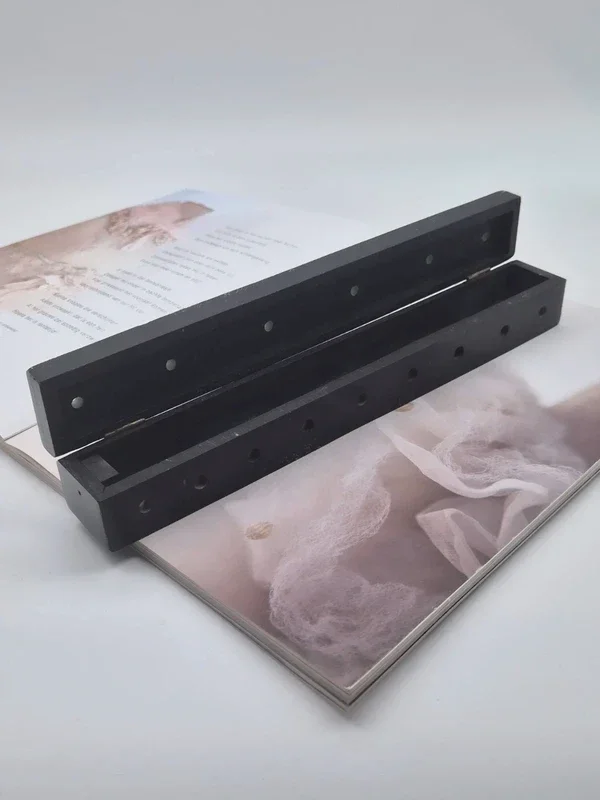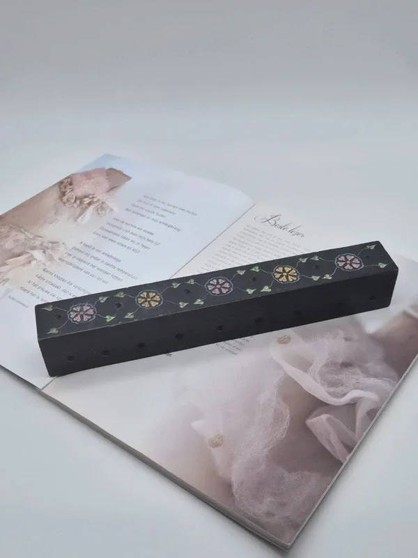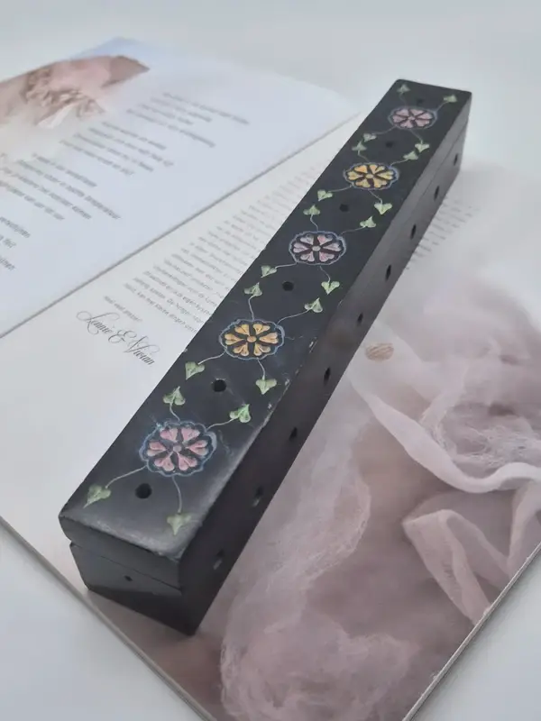 Ontworpen om wierookstokjes te branden, met gaten om de stokjes vast te houden en de as op te vangen.