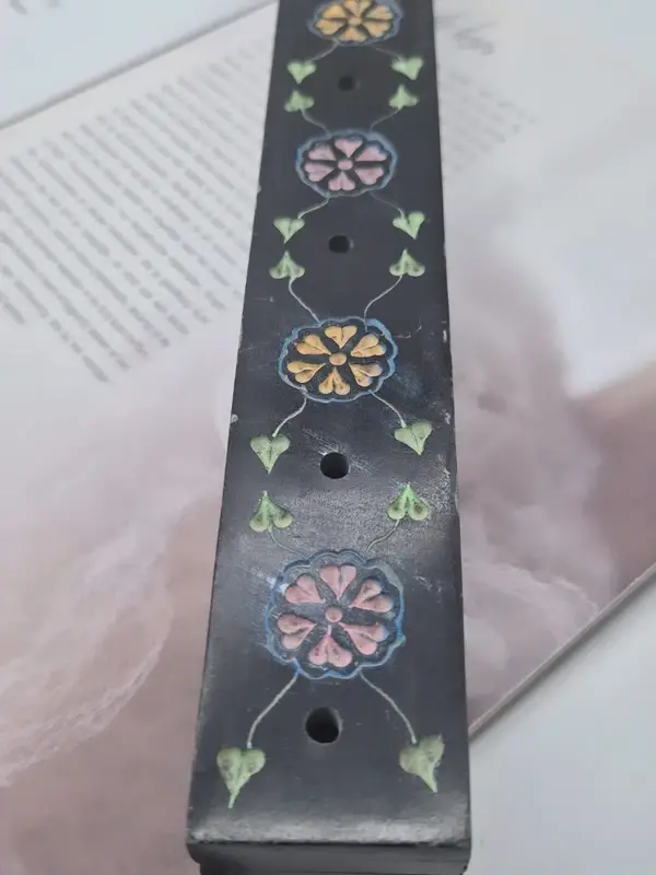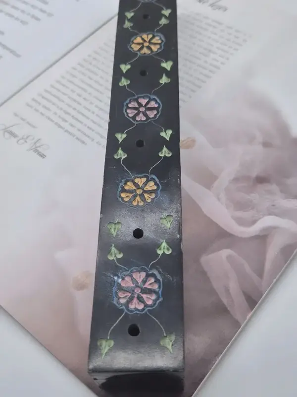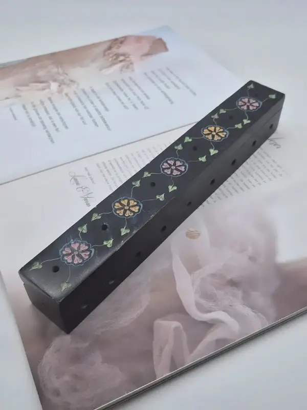 Stenen wierookhouder met geschilderde bloemmotieven.