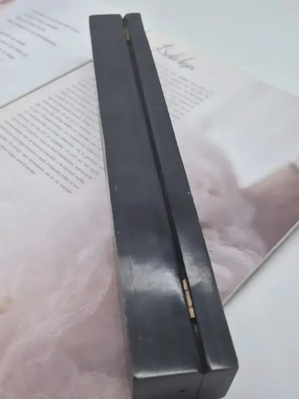 Versierd met handgeschilderde bloem- en bladpatronen in roze, geel, blauw en groen. Heeft een eenvoudig, rechthoekig ontwerp met een scharnierend of afneembaar deksel.