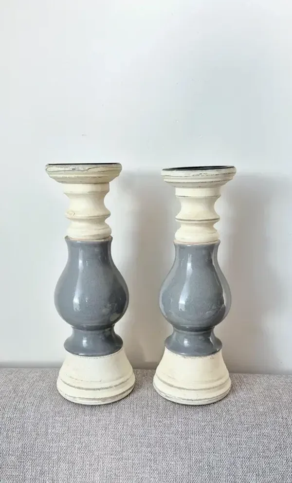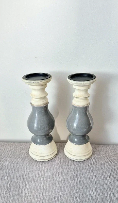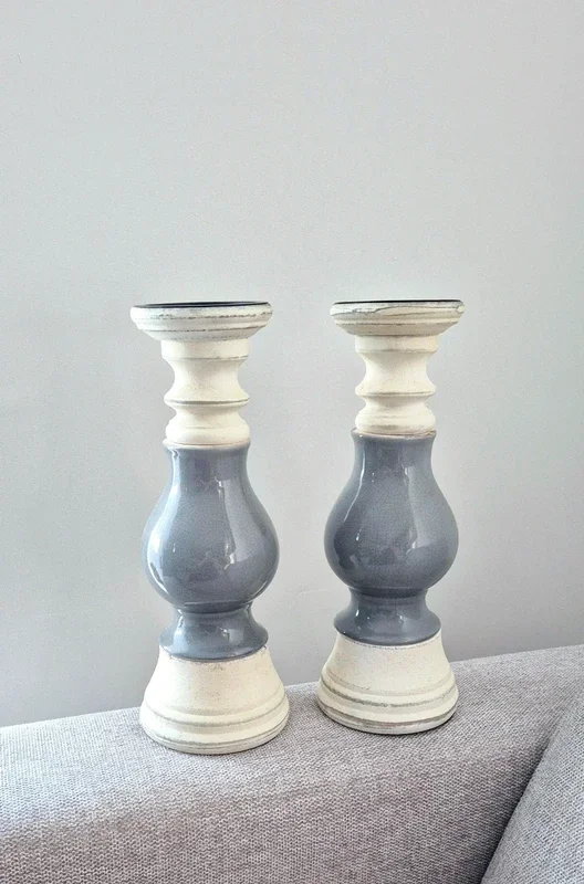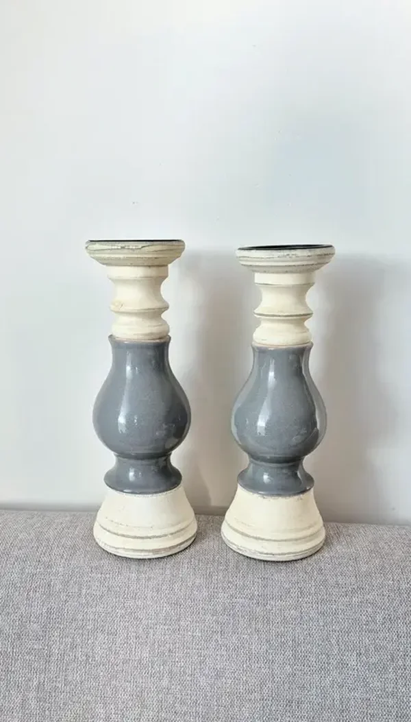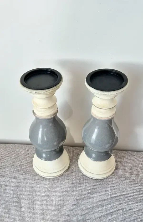 Twee prachtige kandelaars, combinatie hout met keramiek.