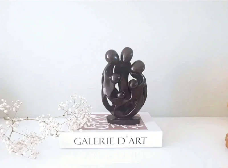 Dit handgemaakte beeld is vervaardigd uit polystone en toont een liefdevolle omhelzing van een gezin.
