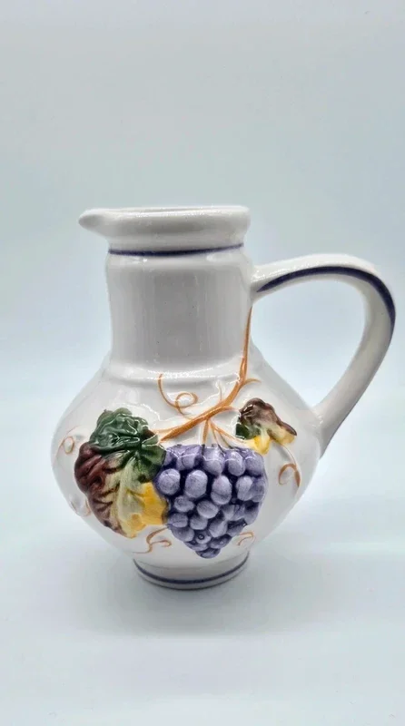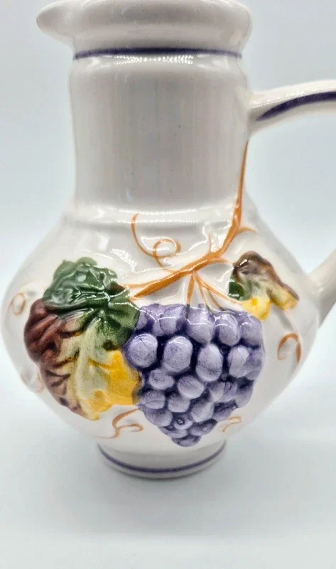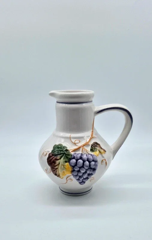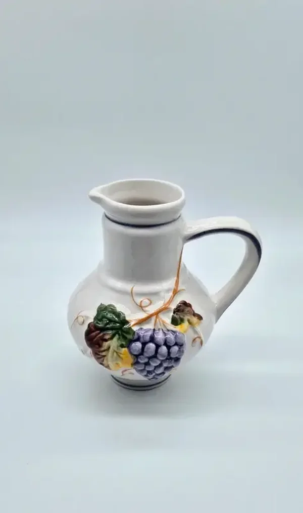 Een vintage handbeschilderde kan met afbeeldingen van druiven en blad in de kleuren paars, groen, bruin en okergeel. Portugal