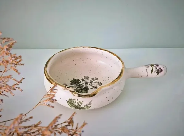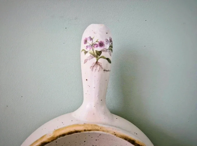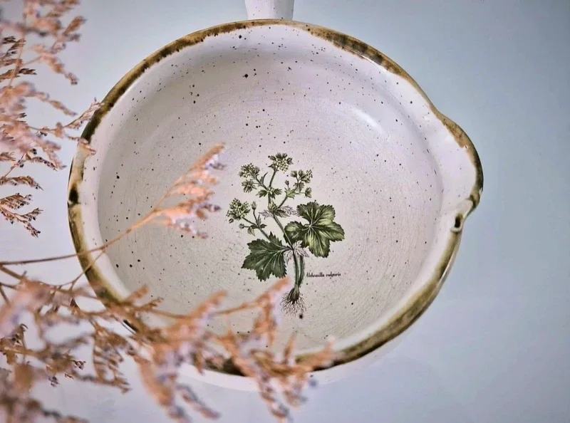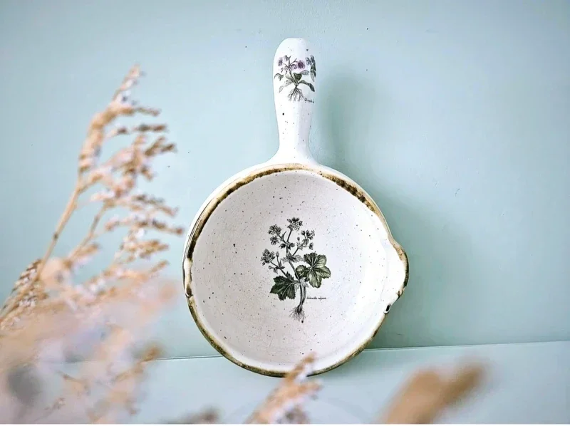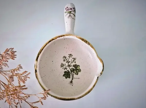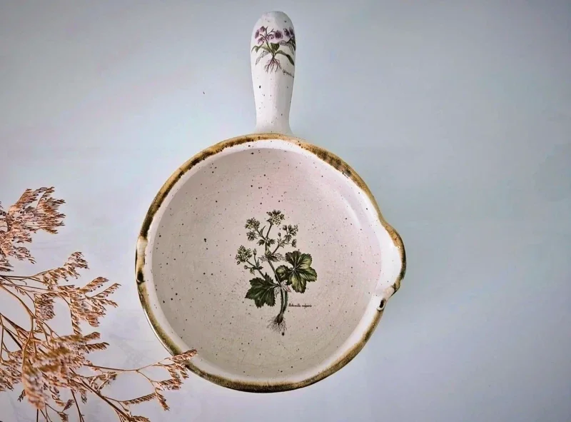Vintage Franse keramische Terre a Feu kookgerei met "Botanical Garden" motieven.