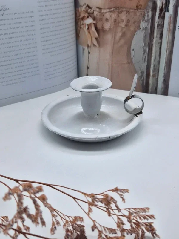 Deze kandelaar met handgreep was bedoeld om met de kaars als lichtbron te kunnen lopen. Nu zetten we hem neer ter decoratie.