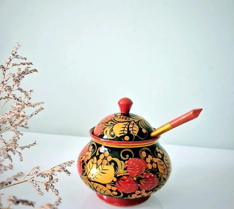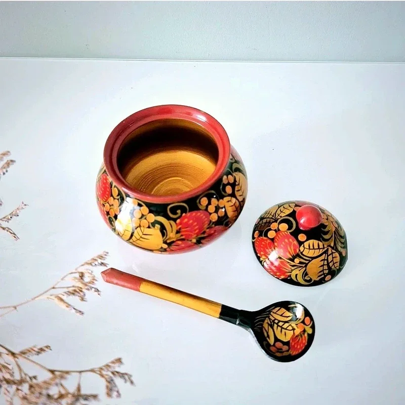 Deze prachtige suikerpot met deksel en lepel is een must-have voor elke verzamelaar van Russische cultuur. Het prachtige aardbeienpatroon is een traditioneel aspect van de Khokhloma-stijl, die zijn oorsprong vindt in de Russische Federatie.