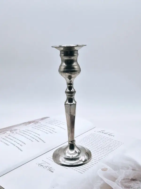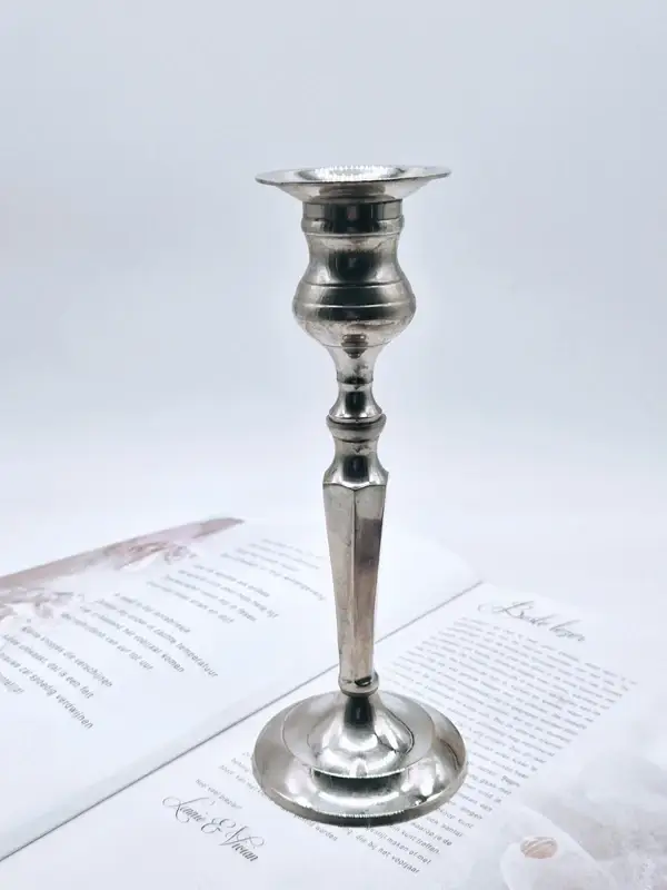 Klassieke, verzilverde kandelaar met een balustervormige schacht op een ronde voet.