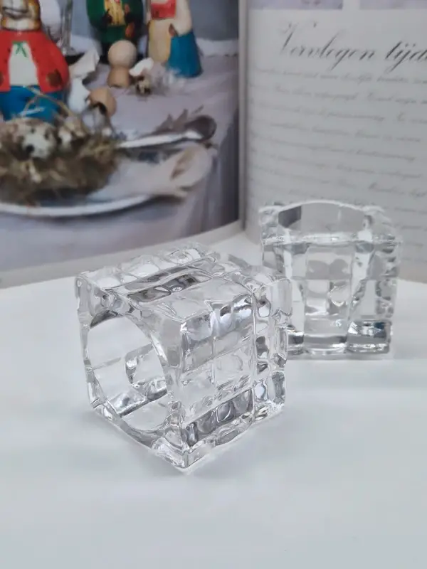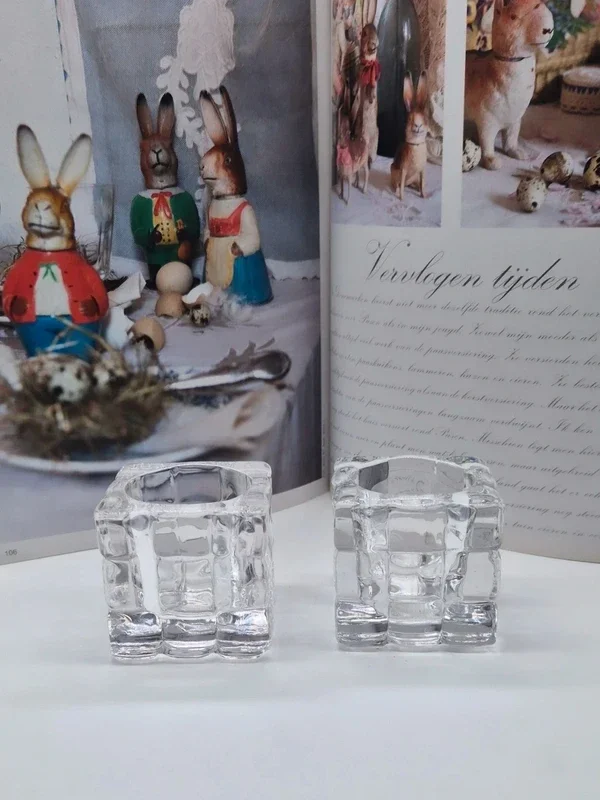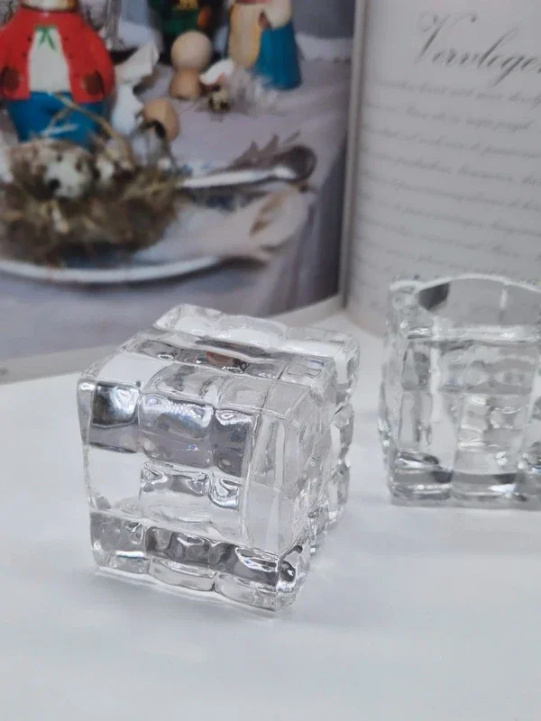 Deze specifieke houders worden vaak aangeduid als "Cube" of "Kubus" kaarsenhouders en worden gekenmerkt door hun zware, transparante glas met een getextureerd of geblokt oppervlak.