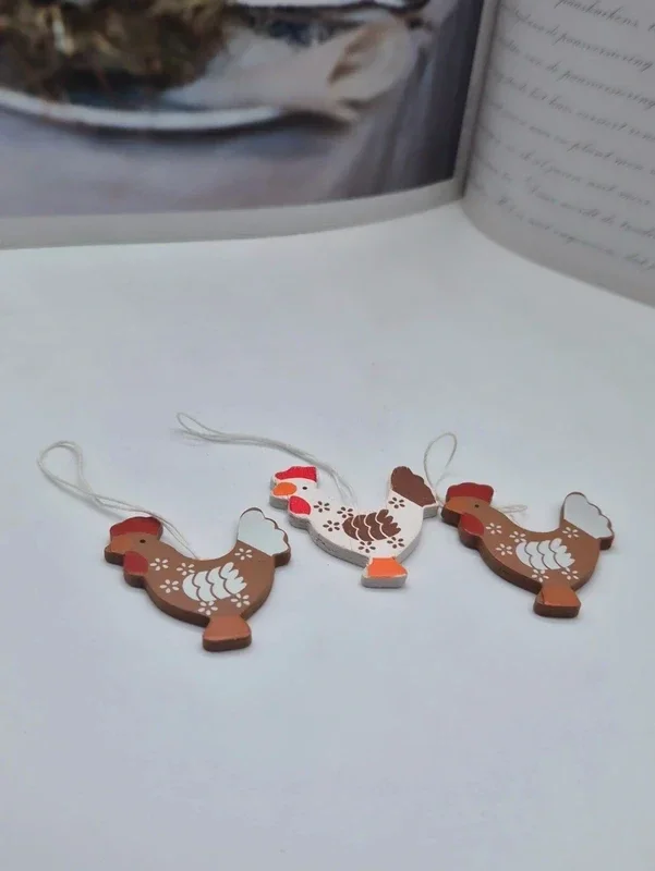 Kippen en hanen: Houten hangers in de vorm van pluimvee, onderaan de afbeelding zichtbaar.