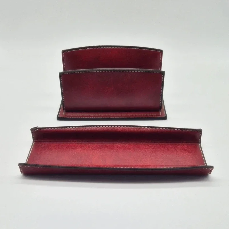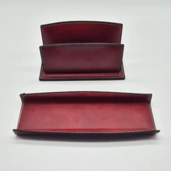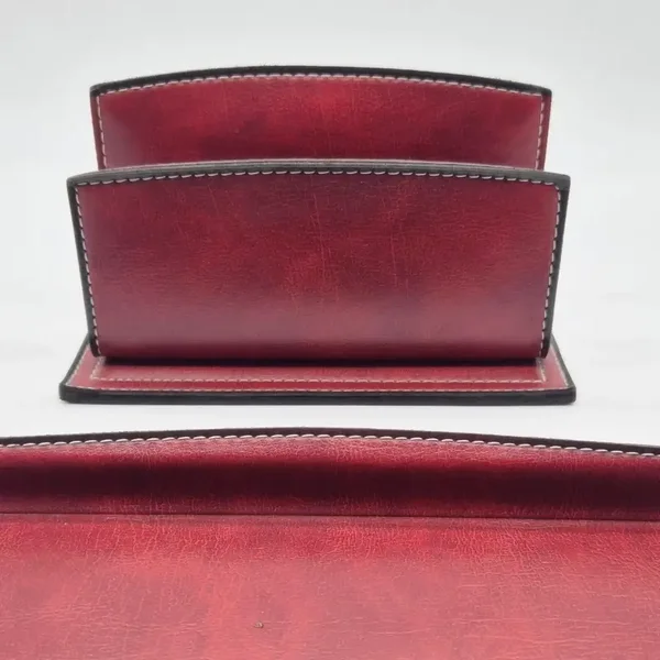 Deze prachtige set bestaat uit een leren brievenhouder en een bijpassende penhouder. De dieprode kleur en de nette stiksels geven een luxe uitstraling.