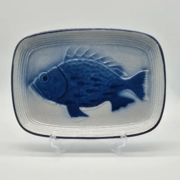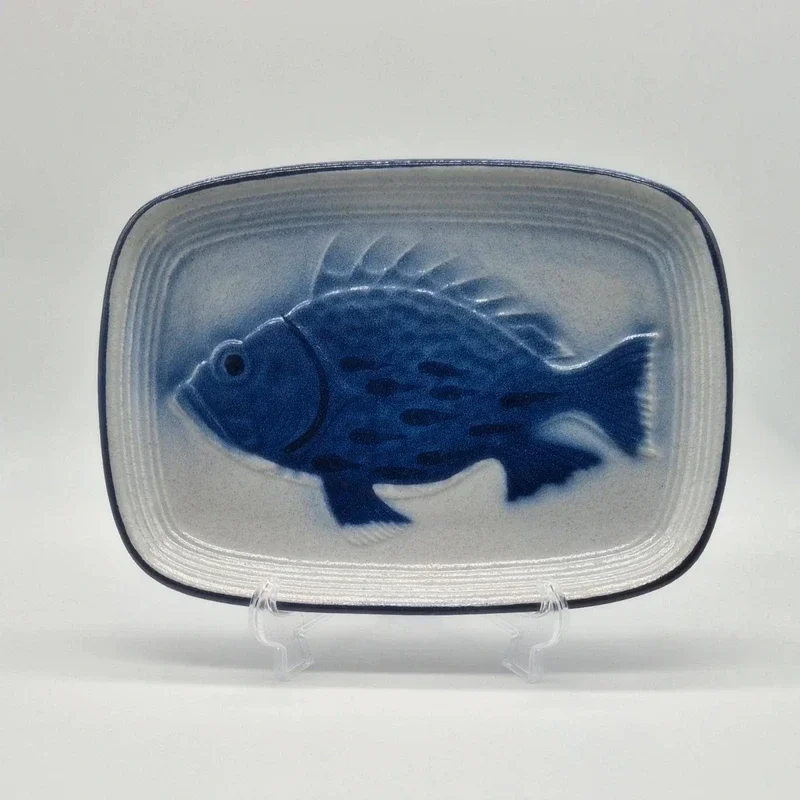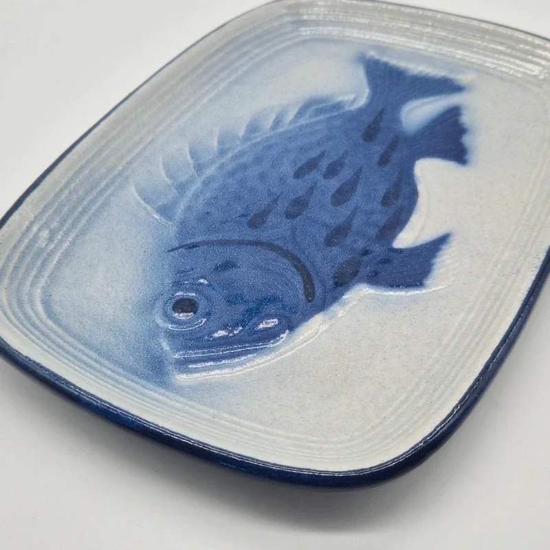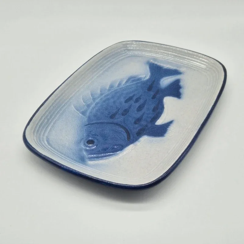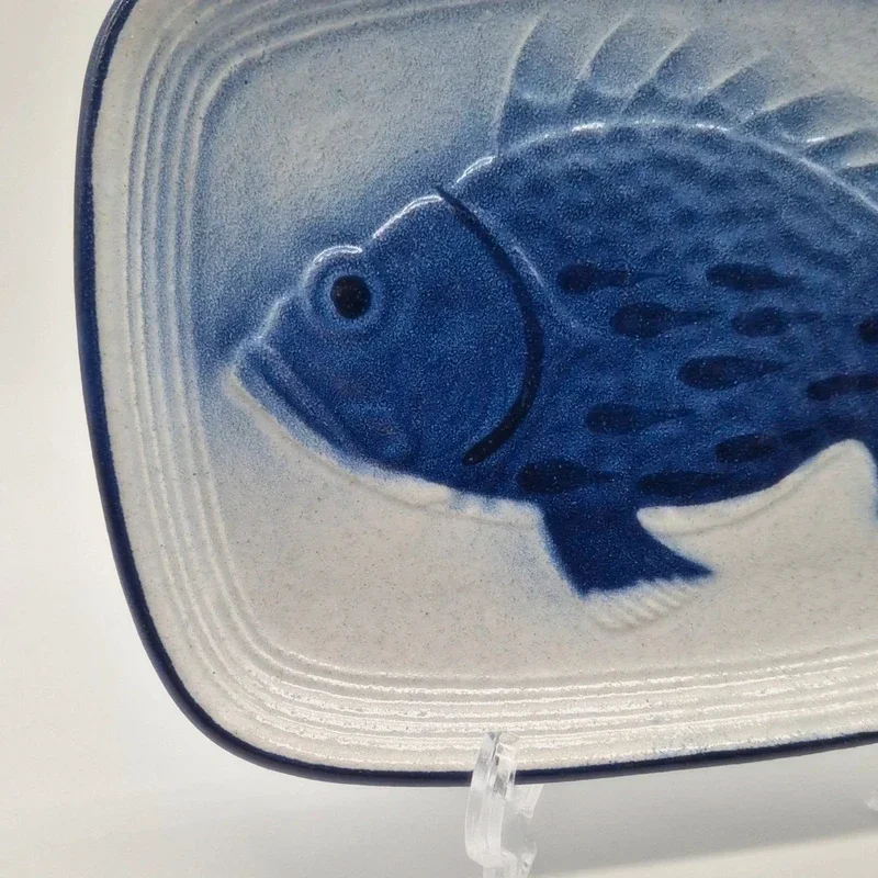 Deze prachtige visschotel zijn afkomstig uit de aardewerkateliers van Saint-Clément. In gemengde tinten lichtgrijs en blauw zijn ze versierd met een geëmailleerde vis.