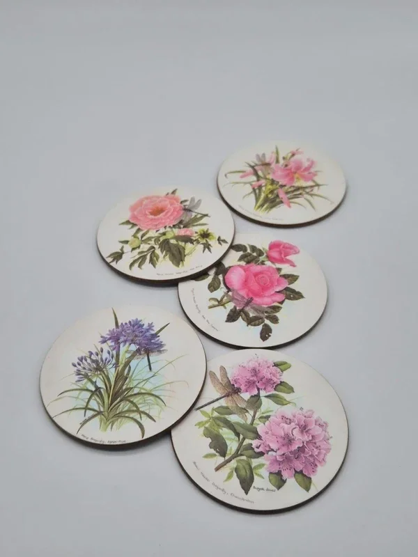 Set van 5 vintage Kelsey melamine Dranofly Flowers onderzetters.