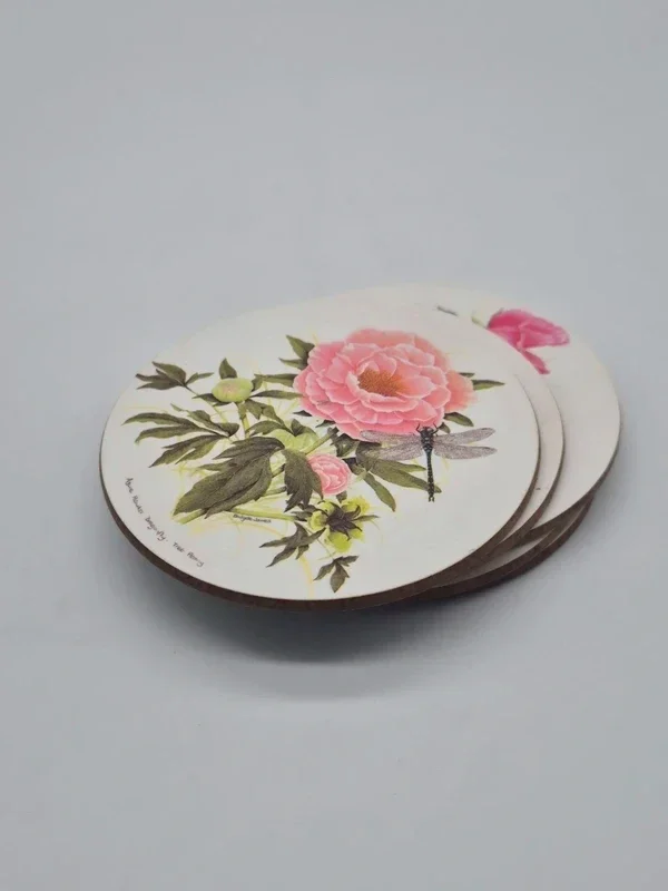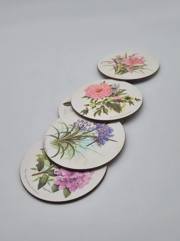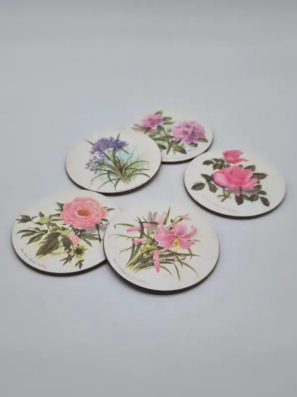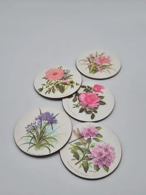 De onderzetters tonen gedetailleerde botanische illustraties van bloemen zoals rozen, agapanthus (Afrikaanse lelie), rododendrons en pioenrozen.