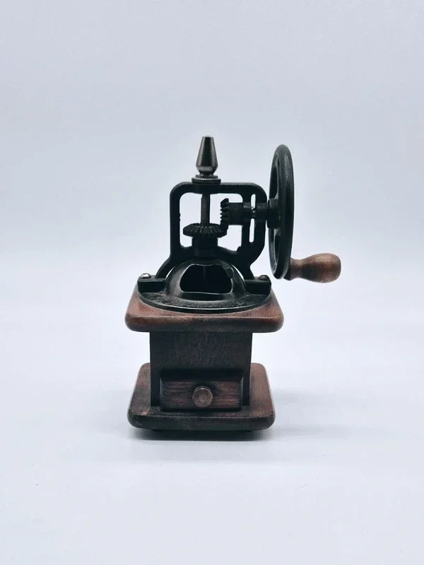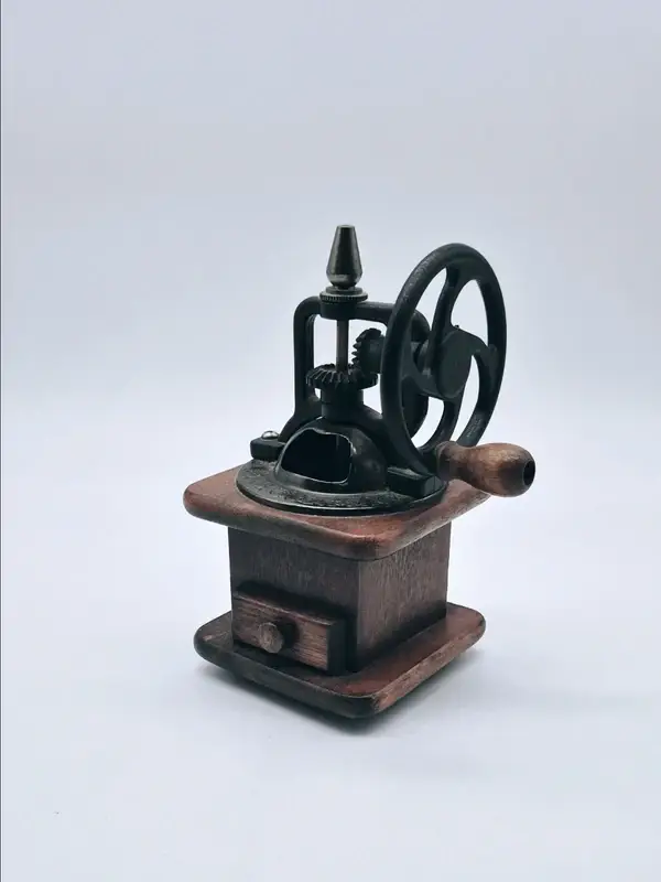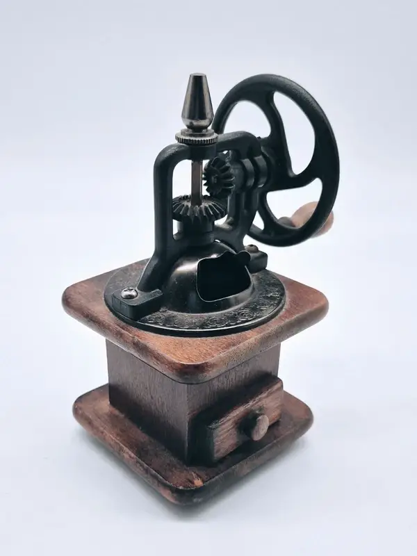 Deze charmante vintage decoratieve handmatige molen combineert een klassieke houten basis met een robuust gietijzeren maalmechanisme.